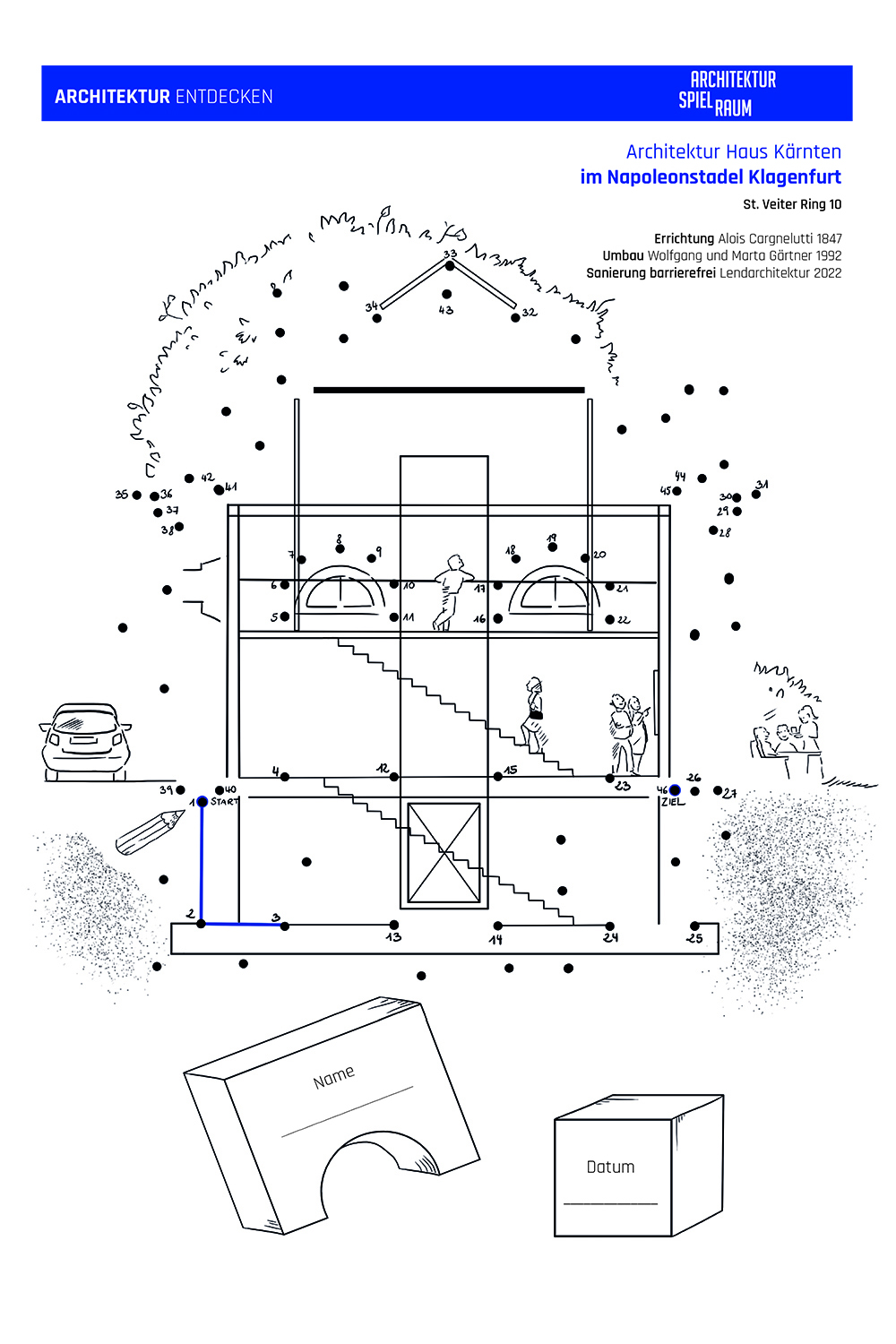 Die Arbeitsblätter können als Vermittlungsinstrument in Schulen und baukulturellen Institutionen eingesetzt werden und sollen zum Besuch der jeweiligen Bauwerke anregen. Die ansprechend gestalteten Karten laden Baukulturvermittler*innen, Jugendliche, Kinder, Pädagog*innen und Schulklassen zum Mitmachen ein: Kurze geschichtliche Informationen zur Entstehung des Bauwerks, Besonderheiten, Materialkunde und interessante Eckdaten wechseln sich mit konkreten Fragestellungen und Hinweisen auf weiterführende Literatur ab. Ein spannendes Punkt-zu-Punkt Bild ermöglicht es, das Bauwerk auch mit dem Stift zu „entdecken“ und die Scheu vor dem Selber-Zeichnen zu überwinden.