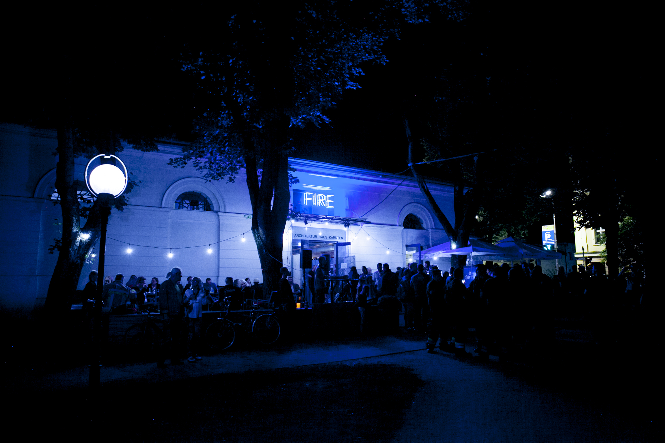 Zur Eröffnung der Installation ist eine Feuerlinie zwischen FIRE und WATER entflammt. Die Aktion schaffte einen Erlebnisraum für die BesucherInnen und band den lokalen Feuerschutz in das Kunstprojekt ein. In Zusammenarbeit mit der Klagenfurter Feuerwehr wurde eine kontrollierte Brandlinie durch den Park gelegt und im Zuge einer feierlichen Zeremonie von der Bürgermeisterin, Dr. Maria-Luise Mathiaschitz, entzündet. Zuerst erleuchtete die Neonschrift FIRE, dann entzündete sich die Feuerlinie, das Feuer bewegte sich durch den Park (Foto 1-3) und löste schließlich das Erleuchten des Schriftzugs WATER auf der gegenüberliegenden Fassade aus (Foto 4).