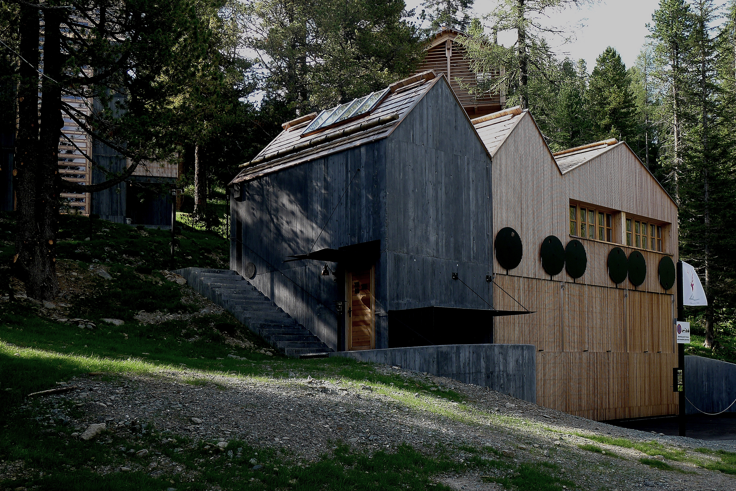 Drei Bauten in Holzblockbauweise mit in die Konstruktion eingefräster Dämmung bilden ein kleines Feriendorf auf der Turrach. Sie wurden nahe der Straße zwischen die Bäume gesetzt, um so den Lärchen- und Zirbenbestand möglichst unberührt zu lassen. Zum Ensemble gehört auch eine „Scheune“ mit einem großen Gemeinschaftsraum, der für verschiedene Ereignisse und Feste gemietet werden kann. Diese „Scheune“ wurde in Holzständerbauweise mit vertikaler Holzlattenfassade errichtet. Alle Nebengebäude und Sockelbereiche sind eine Betonsandwichkonstruktion.