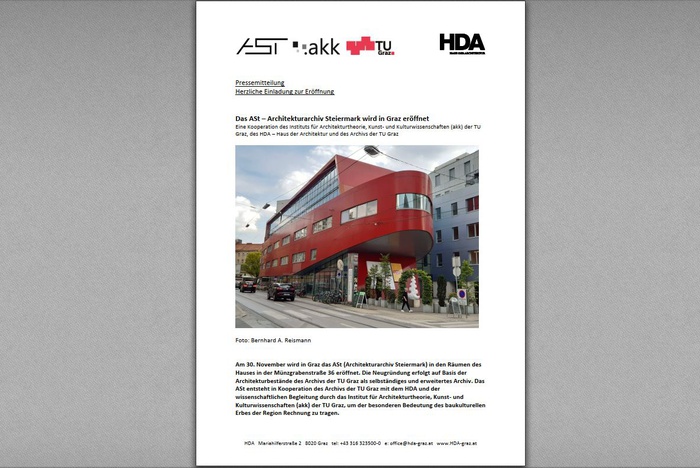 EröffnungAm 30. November wird in Graz das ASt (Architekturarchiv Steiermark) in den Räumen des Hauses in der Münzgrabenstraße 36 eröffnet. Die Neugründung erfolgt auf Basis der Architekturbestände des Archivs der TU Graz als selbständiges und erweitertes Archiv. Das ASt entsteht in Kooperation des Archivs der TU Graz mit dem HDA und der wissenschaftlichen Begleitung durch das Institut für Architekturtheorie, Kunst- und Kulturwissenschaften (akk) der TU Graz, um der besonderen Bedeutung des baukulturellen Erbes der Region Rechnung zu tragen.