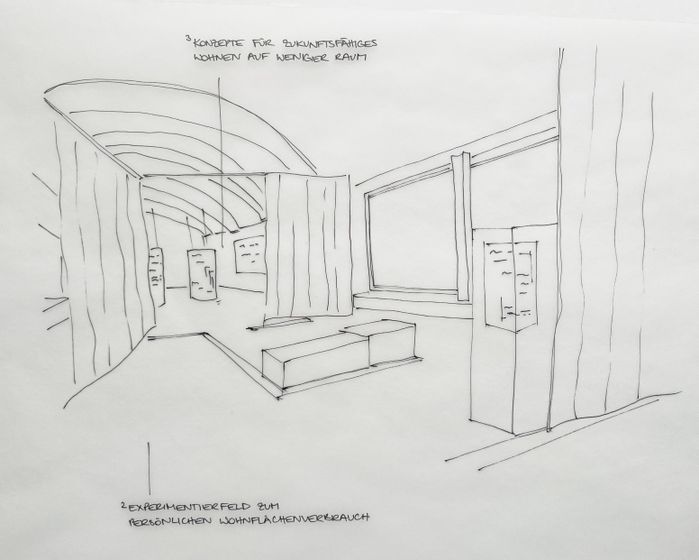 Ein interaktives Raumfeld lädt Besucher:innen dazu ein, den eigenen Bedarf praktisch zu erproben: Wie viel Platz brauchen wir wirklich zum Wohnen, Arbeiten oder Zusammenleben? Ergänzt wird diese Erfahrung durch Fakten, Daten und Zukunftsszenarien rund um das Wohnen – von geteilten Räumen über neue Wohnmodelle bis hin zur Umnutzung leerstehender Einfamilienhäuser.