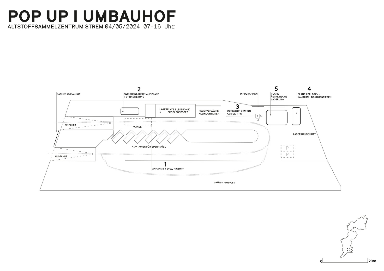 Infrastruktur tritt meist unsichtbar in Erscheinung, solange sie funktioniert. Die Ausstellung UMBAUHOF rückt daher jene Orte in den Fokus, die unser tägliches Leben ermöglichen, ohne im öffentlichen Bewusstsein präsent zu sein: Bauhöfe und Abfallsammelstellen in der Steiermark. Als unverzichtbare Bestandteile der kommunalen Daseinsvorsorge bilden sie ein funktionales Netzwerk. Theoretisch lässt sich das Projekt auch mit Michel Foucaults Begriff der Heterotopie beschreiben – Orte mit eigener Logik, Zeitlichkeit und sozialer Relevanz, die im Raumgefüge oft marginalisiert sind. Ausgehend von unserem Projekt UMBAUHOF wird diese Infrastruktur als Schlüsselort einer zukünftigen, zirkulären Baupraxis im ländlichen Raum verstanden. Mittels zeichnerischer Dokumentation, fotografischer Serien, Filmsequenzen, Tonaufnahmen und Gesprächen mit Nutzer:innen und Mitarbeiter:innen werden räumliche Qualitäten und atmosphärische Eigenheiten sichtbar: das Improvisierte, das Roh-Baustellenhafte und zugleich die hohe organisatorische Präzision. So entstehen kartografische Mapping-Arbeiten, die Bauhöfe durch ihre spezifischen räumlichen Strukturen vergleichbar machen und als Typologie erkennbar werden lassen. Die entstandenen Arbeiten werden in einer Ausstellung präsentiert und geben Einblicke in das Projekt UMBAUHOF – als Beitrag zum Diskurs über zirkuläres Bauen und zur Sichtbarmachung dieser unterschätzten, aber zukunftsweisenden Infrastrukturen.
