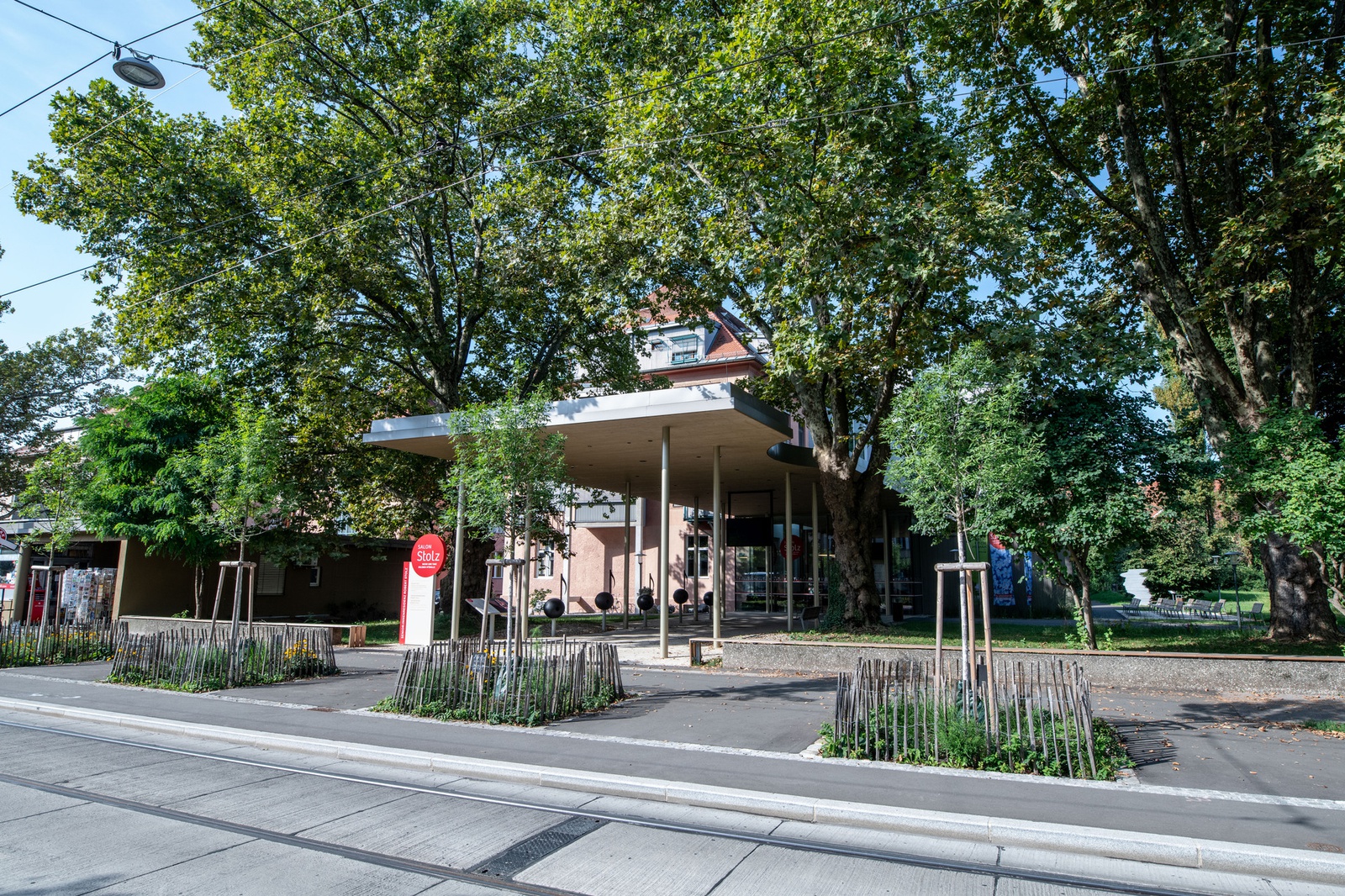 Though modest in its architectural scale, the intervention at Salon Stolz demonstrates an exemplary impact on the urban fabric. Strategic urban decisions—such as removing the park fence, redefining the entrance axis through a new canopy, and opening the building façade—significantly amplify the project’s contribution to public life by directly integrating the park with the existing complex. Through the use of simple yet effective architectural elements—such as a canopy, an openable façade, and a bench—it takes a bold step in transforming a previously closed-off area into a publicly accessible space. Salon Stolz serves as a compelling model for how small-scale interventions can catalyze broader urban renewal and social engagement. The space invites intergenerational dialogue and shared presence—something architecture often aspires to, but rarely conjures so organically.