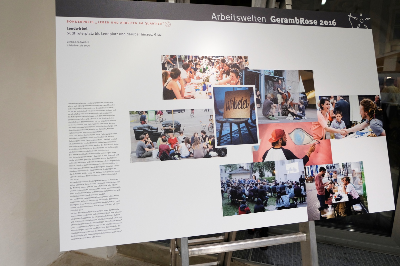 AusstellungDie GerambRose wird vom Verein BauKultur Steiermark als Würdigung für Leistungen verliehen, die im Sinne der Erhaltung oder Schaffung qualitätsvoller Baukultur erbracht wurden, wobei die gemeinsame Arbeit von Bauherrschaft, Planer oder die Planerin, Ausführenden im Mittelpunkt des Preises steht. Die GerambRose 2016 widmet sich dem Thema „Arbeitswelten".