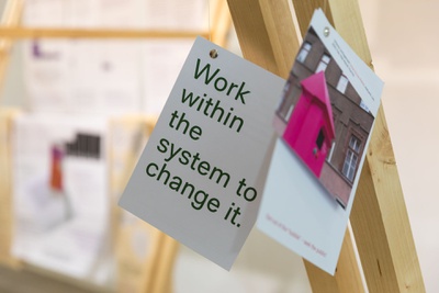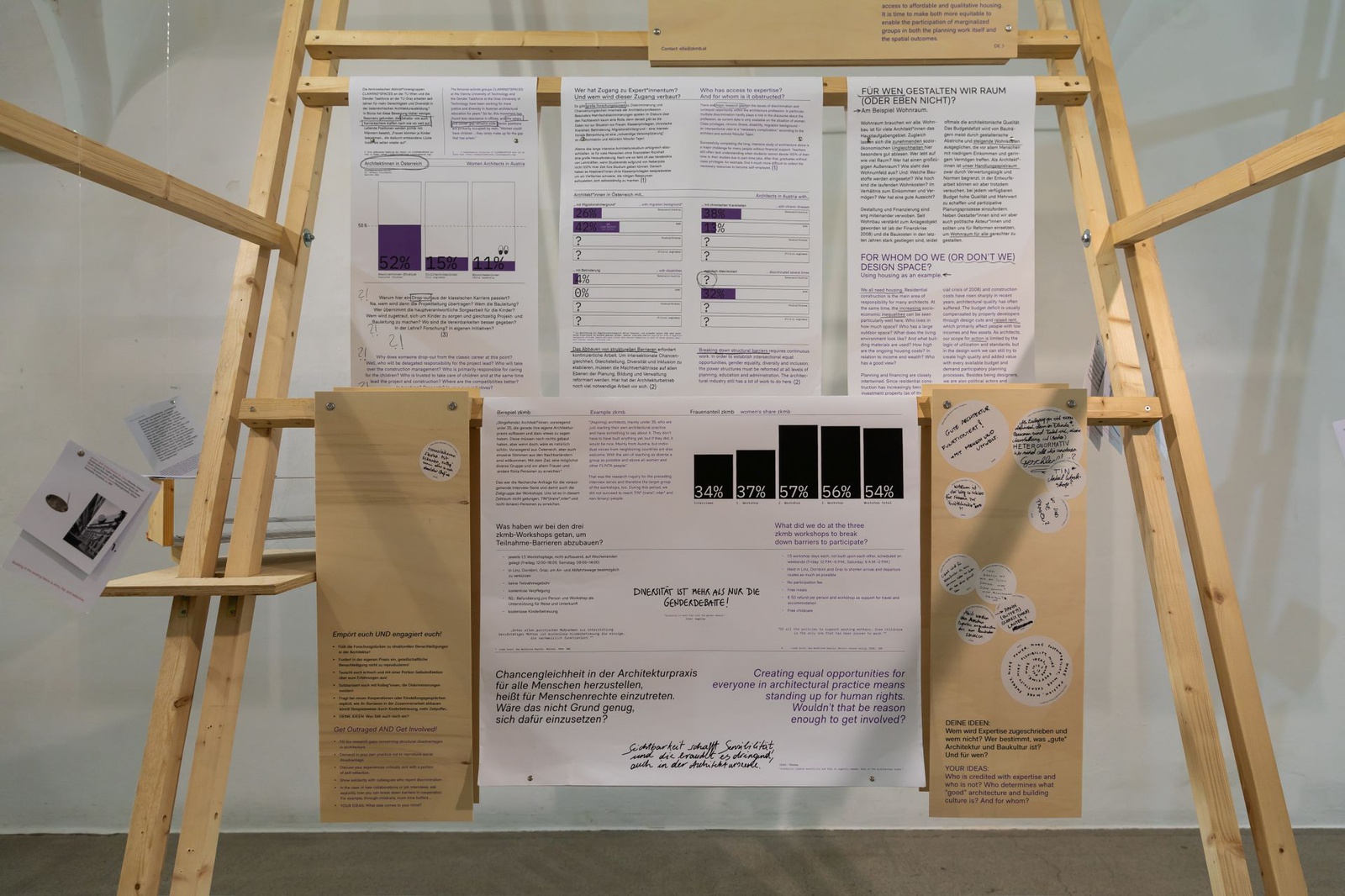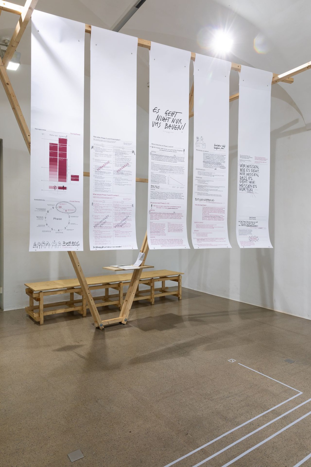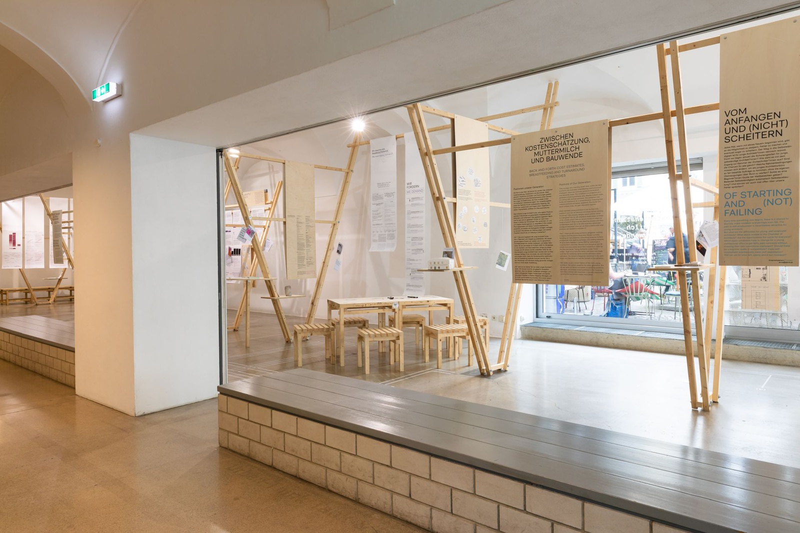 AusstellungDie Ausstellung „Zwischen Kostenschätzung, Muttermilch und Bauwende“ versammelt die drängendsten Fragen, Positionen und Forderungen junger Architekt:innen in Österreich. Die Herausforderungen sind groß: die Bauwende aktiv mitgestalten, gerechtere Arbeitsstrukturen schaffen und die eigenen Handlungsspielräume durch veränderte Rahmenbedingungen vergrößern. Gezeigt wird ein kollektiv kuratiertes Mapping, das gemeinsam mit 60 Architekt:innen erarbeitet wurde und den Auftakt zu einer offenen Diskussion bildet. Die Installation lädt zum Austausch ein, stellt Fragen und soll durch Kommentare der Besucher:innen weiter wachsen.