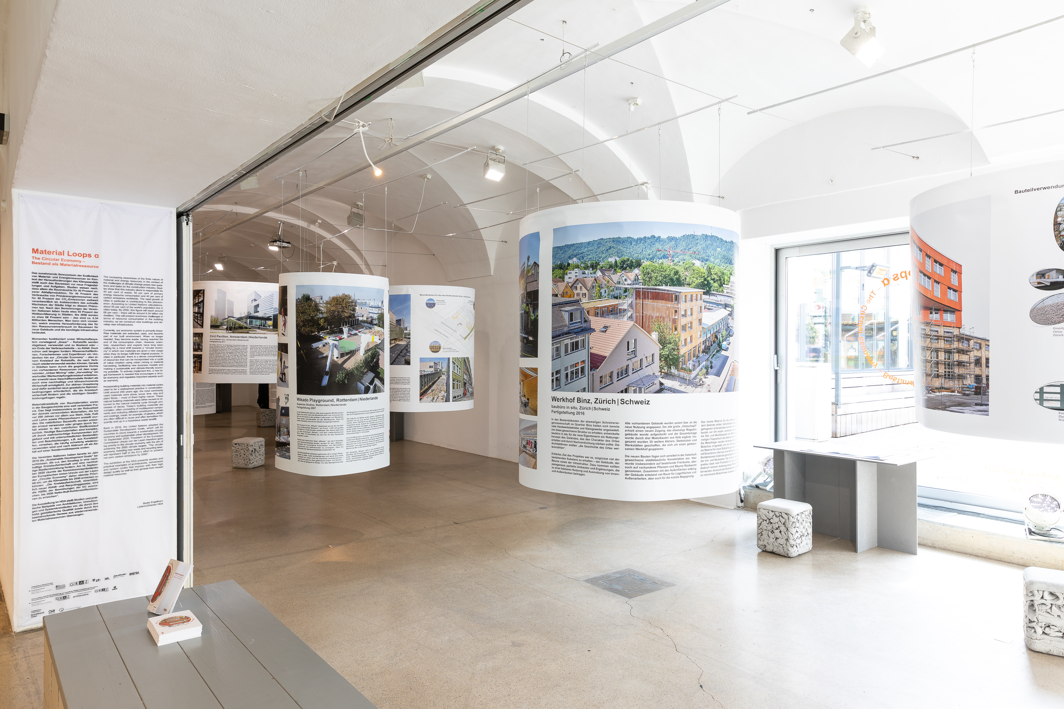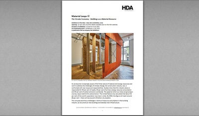 Die Endlichkeit von Material- und Energieressourcen stellt das Bauwesen vor neue Fragestellungen und Aufgaben im Kontext der Herausforderungen des Klimawandels. Die Ausstellung im HDA widmet sich dem Thema "Materialkreislauf". Sie stellt Studien und praktische Beispiele von Architekturen, Umnutzungen und Systemkreisläufen vor, die durch ihre hohe gestalterische Qualität sowie durch ihre beeindruckende Genese aus wiederverwendeten Materialressourcen überzeugen.
