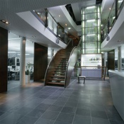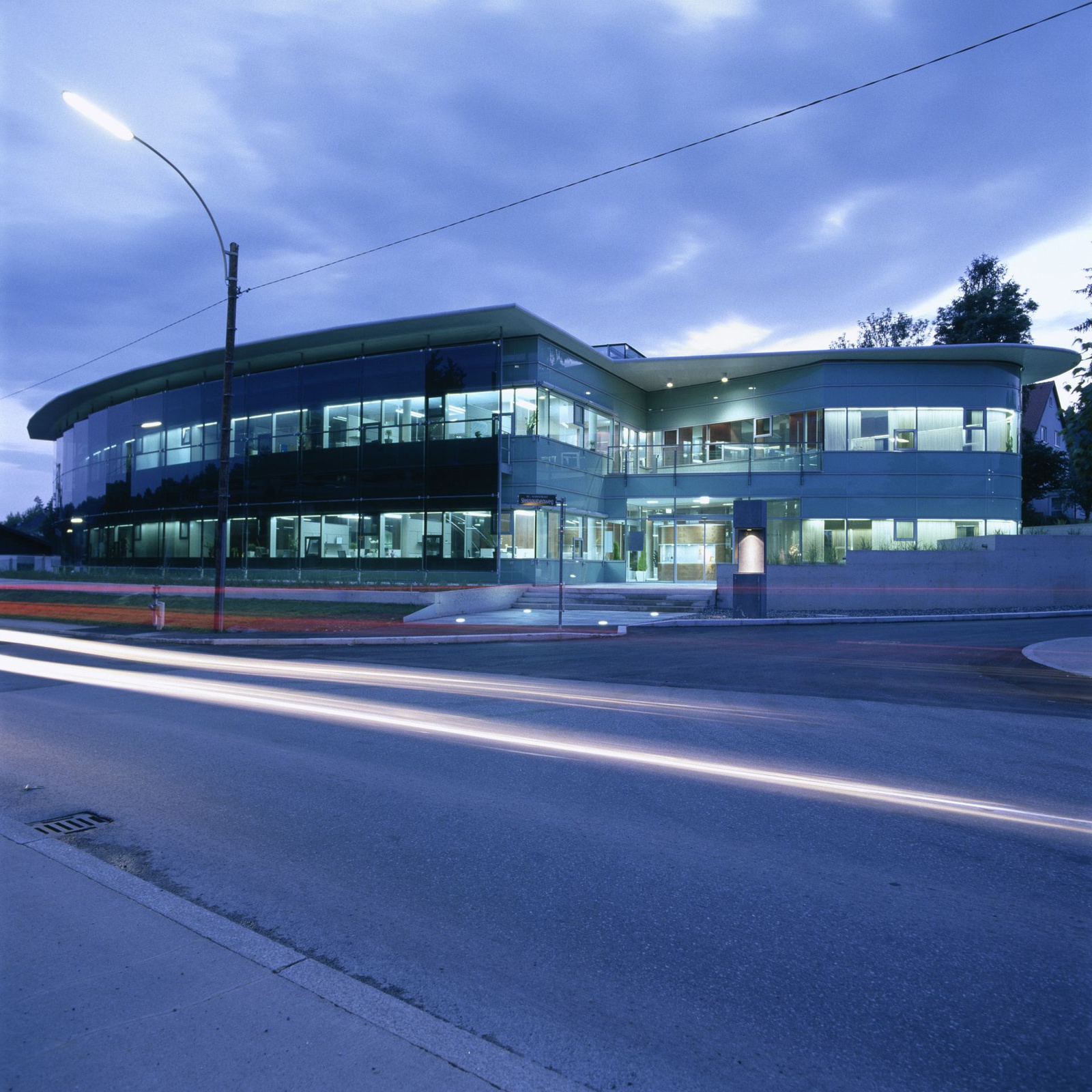 Das Gebäude im Grazer Bezirk Mariatrost fügt sich in einem Schwung bzw. passgenau in die gerundete Grundstückstopografie ein. Zwei zueinander geschwungene, ineinander verschobene, verglaste Baukörper bilden einen lang gestreckten und dynamischen Bau. Zwischen ihm und dem dahinter liegenden, altehrwürdigen Erzherzog Johann‐Haus bildet sich ein geschützter Freibereich mit Retensionsteich und darüber großzügig auskragendem Holzdeck.