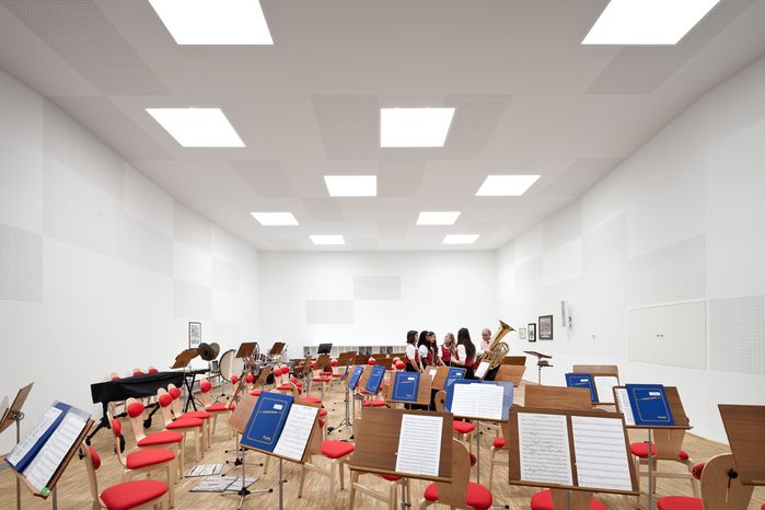 vorbehalten. Die gleichmäßige natürliche Belichtung erfolgt von oben über Lichtkuppeln. Die raumakustischen Maßnahmen sollten den Raum nicht dominieren und wurden in einem Spiel aus gelochten und glatten weißen Wandverkleidungen