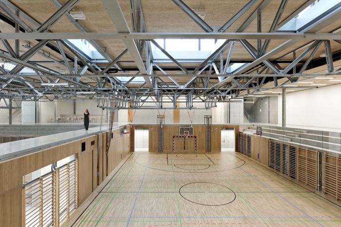 Die niederösterreichische Stadt Gloggnitz kämpft mit Strukturproblemen, denen man auf unterschiedliche Art entgegnet. Beim Hereinfahren in den Ort preist gleich das erste Schild im Kreisverkehr die „Einkaufsstadt Gloggnitz“ an, zugleich wird das Stadtzentrum durch das große neue Schulzentrum dominiert, welches programmatisch Bildung als Zukunft der Stadt hervorhebt. Zwar war bereits zuvor das alte Schulzentrum, bestehend aus Volksschule, Mittelschule und Polytechnikum, an diesem prominenten Standort, doch der Neubau umfasst nicht nur zusätzlich das Sonderpädagogische Zentrum, er ist auch kompakter, was vor allem dem quadratischen Grundriss von ca. 70 auf 70 Meter geschuldet ist. Ein solches Volumen kann als Barriere wirken. Doch das Architekturbüro von Dietmar Feichtinger und die Bürgermeisterin, Irene Gölles, machen plausibel, wie diese gemeinsame bewusste Entscheidung genau das Gegenteil bewirken kann und soll. Die im Wettbewerb geforderte Nachhaltigkeit betraf nicht nur das ökologische Konzept, das mit Wärmepumpe, Massespeicherung und Solarzellen heutigen Standard erfüllt. Vielmehr ging es vor allem darum, die vielfältigen sozialen und pädagogischen Aktivitäten zu einem nachhaltigen Austausch mit der ganzen Stadt zu verbinden. Das geschieht auf mehreren Ebenen. Zum einen bietet das Schulzentrum in den eigenen Räumen die Möglichkeit zur Nutzung durch Sportvereine, Veranstaltungen aller Art usw. Zum anderen ist die Erdgeschosszone konsequent raumhoch verglast, sodass PassantInnen unmittelbar Einblick in die Werkstatt-, Experimentier- und Technikräume haben, die hier untergebracht sind. Vor allem aber werden die zentral gelegenen Sporthallen – eine Turnhalle, eine Kletterwand, ein Gymnastikraum –, auf die man stößt, sobald man das Gebäude betritt, Besuchende visuell und akustisch in ihren Bann ziehen. Wahrscheinlich eine Hommage an Josef Lackners Ursulinengymnasium in Innsbruck (1980), funktioniert die Botschaft hier im Stadtzentrum noch viel besser: spielende, lernende, tobende Kinder sind die beste Investition in die Zukunft. Die „offene Form“ unterstützt auch das dreidimensionale Raumfachwerk aus Stahl, das 30 Meter weit spannt, genauso wie die Clusterung der Klassenräume im ersten Obergeschoss jeweils um einen „Marktplatz“ und diese wiederum um einen großen offenen Hof auf dem Dach, der zudem wunderbare Ausblicke in die Umgebung ermöglicht. Dazu belastbare Materialien wie Fichtenholz für die Innenräume (Lärche im Außenbereich), einfache Holzwolle für die Decke und zahlreiche Durchgänge oder -blicke dürften dem Anliegen der Gemeinde nach vielfältigem Austausch, Inklusion, Diversität und Nachhaltigkeit genau entsprechen. (Text: Angelika Schnell für den ZV-Bauherrenpreis)