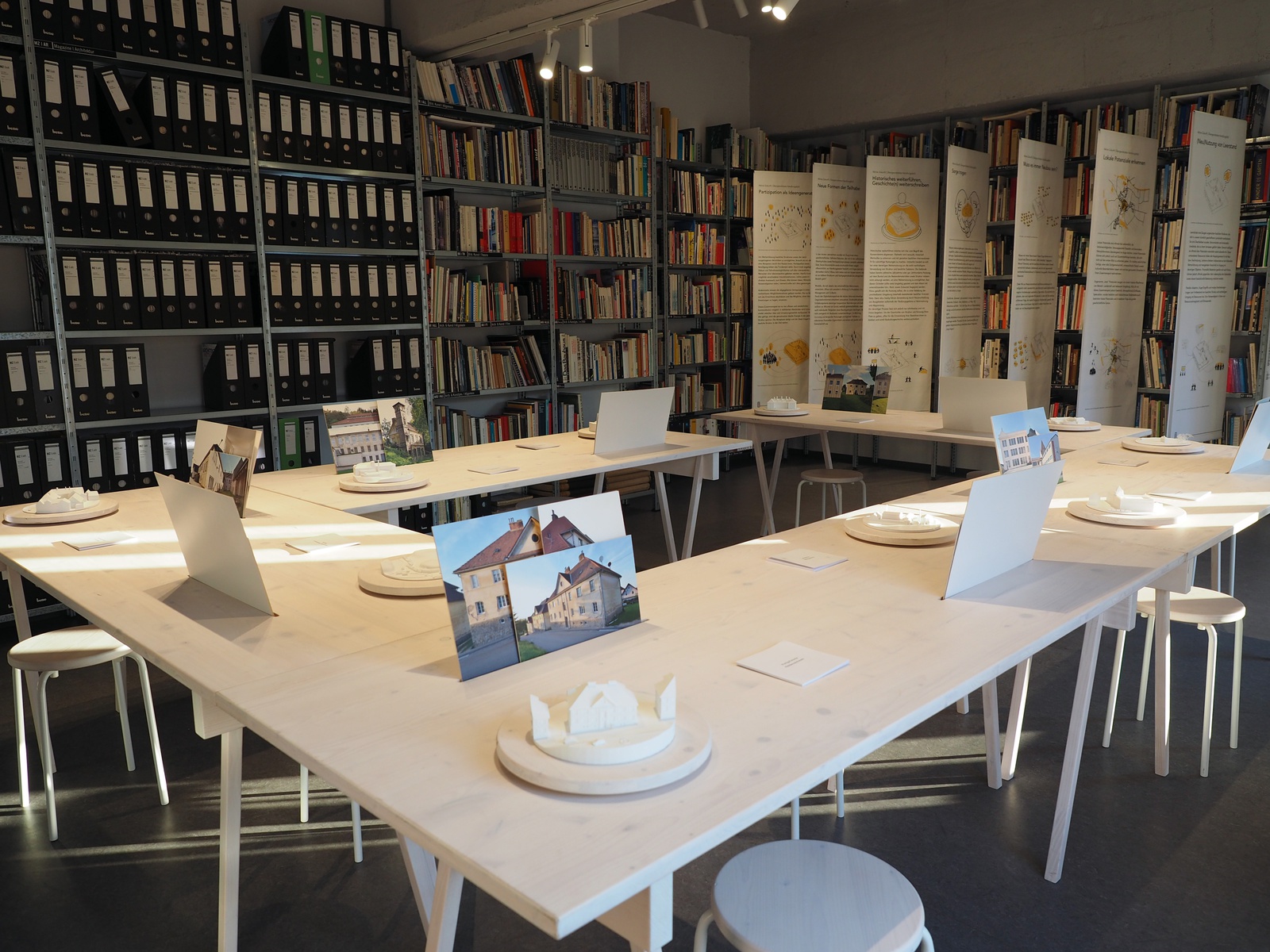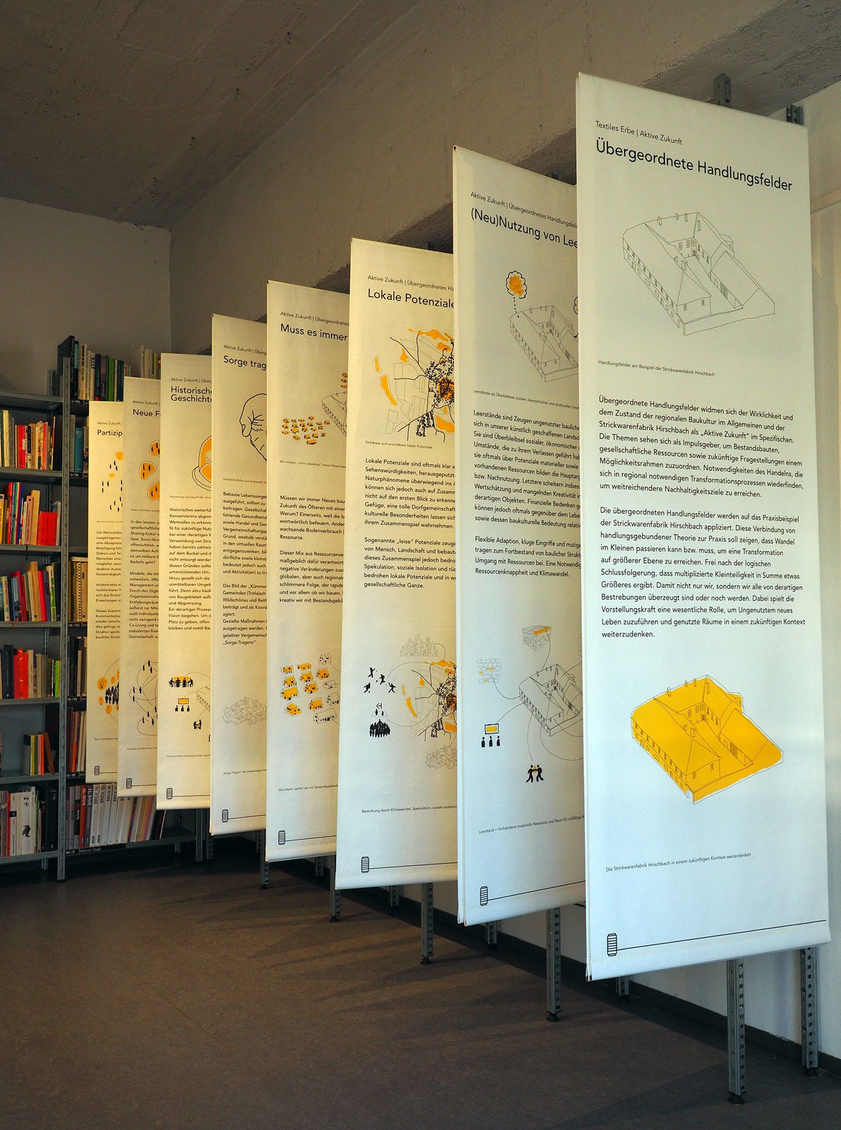 Auf langen Tischen präsentiert, laden Modelle sowie dazugehörige Publikationen die Besucher:innen zur Auseinandersetzung mit der Wiederbelebung ehemals fürs Textil genutzter Gebäude und Infrastrukturen ein. Die bewegte Geschichte, die Architektur und fotografischen Momentaufnahmen sorgen für eine wohl dosierte wie inklusive Ausstellungserfahrung. Verwoben mit dem Kern der Ausstellung ergänzen übergeordnete Handlungsfelder, die sich mit dem Zustand der Baukultur sowie möglichen Transformationsprozessen auseinandersetzen.