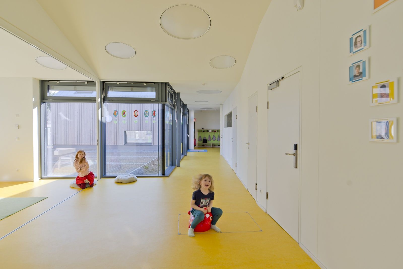 Ein wesentlicher Aktivator für die geistige und seelische Entwicklung der Kinder ist natürliche Belichtung und vor allem Besonnung. Deshalb wurden die Haupträume mit großzügigen Fensterflächen ausgestattet, sodass im Winterhalbjahr die wenigen Sonnenstunden ihre volle Wirkung entfalten können. Im Sommer sind die Gruppenräume durch den außenliegenden Sonnenschutz schattig und kühl.