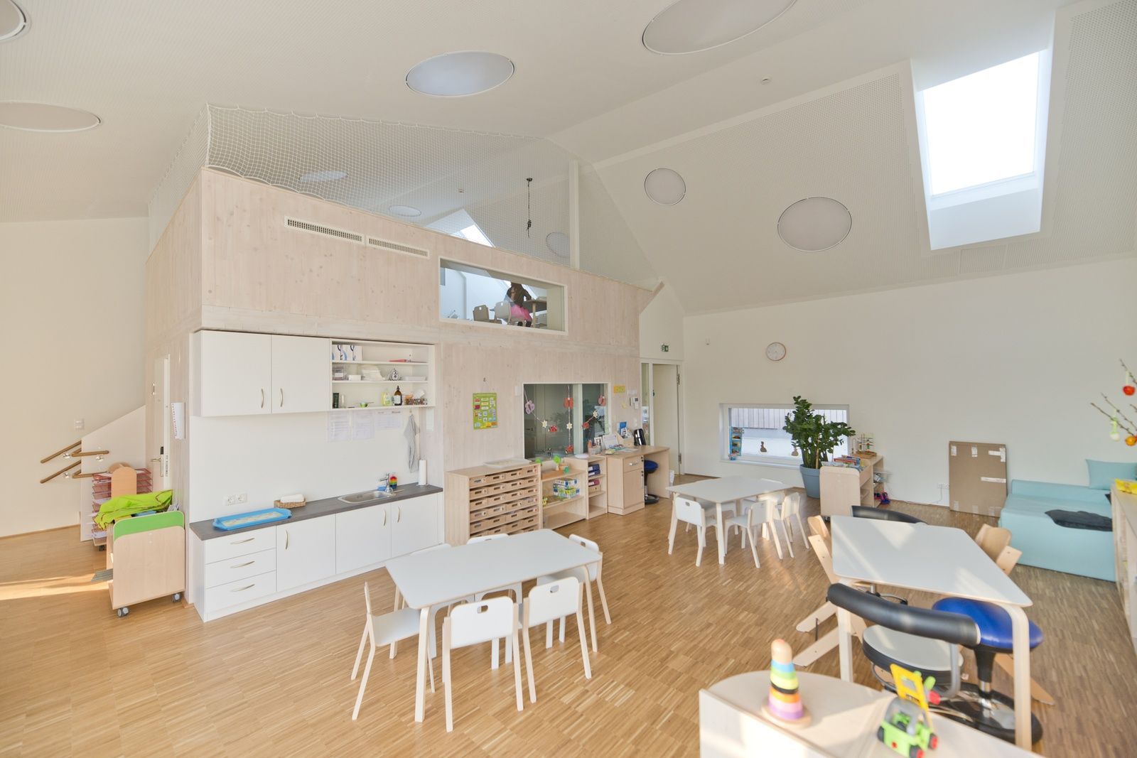 Der Eingang erfolgt straßenseitig von Norden, südseitig angeschlossen befinden sich – perlenschnurartig über eine als Spielstraße und Garderobenbereich gestaltete Gangzone – die einzelnen Gruppenbereiche. Die Gruppenräume haben eine relativ neutrale, dem Quadrat angenäherte Grundform mit großzügiger Raumhöhe und bieten den Kindern eine klare Orientierung. Dem quadratförmigen Großraum für gemeinsame Aktivitäten sind räumlich Podeste, Galerien und Nischen als Kuschel- und Spielecken zugeordnet. Durch flexible Einrichtungsgegenstände können die verschiedensten Spiel- und Aktivitätsbereiche jederzeit definiert und angeordnet werden. Die Verwendung von speziell auf Kinder abgestimmten Elementen (z.B. Fenster auf Augenhöhe, zahlreiche Ein- und Ausblicke) ermöglicht den Kindern ein Interagieren mit der Architektur. So soll es zu einer hohen Identifikation mit dem Gebäude kommen.