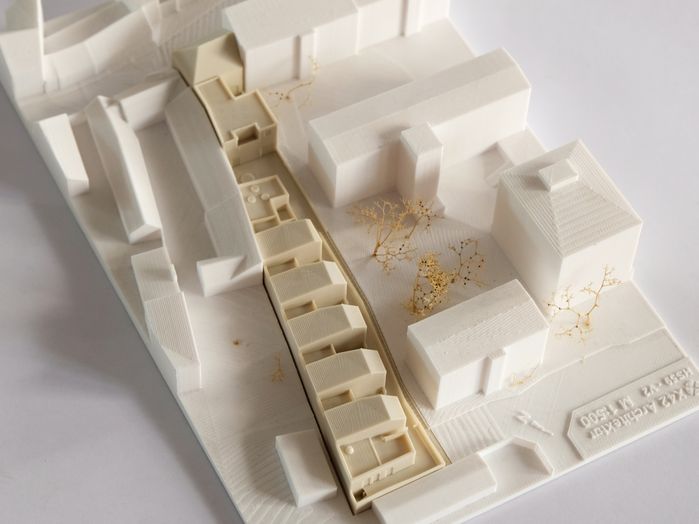 X42 Architektur hat die Wohntypologie „Reihenhaus“ für diesen speziellen Ort neu interpretiert: Der bestehende Gebäudeteil der ehemaligen Schuhleistenfabrik an der Hauptstraße wurde umgebaut und erweitert. Im hinteren Teil des Nord-Süd gestreckten Grundstücks haben die Planer:innen sieben Stadthäuser mit jeweils einem eigenen, vorgelagerten Garten auf einem offenen Garagendeck in einer Zeilenstruktur angeordnet. Die Aufenthaltsräume im Erdgeschoss orientieren sich zu diesen introvertierten Gärten hin.